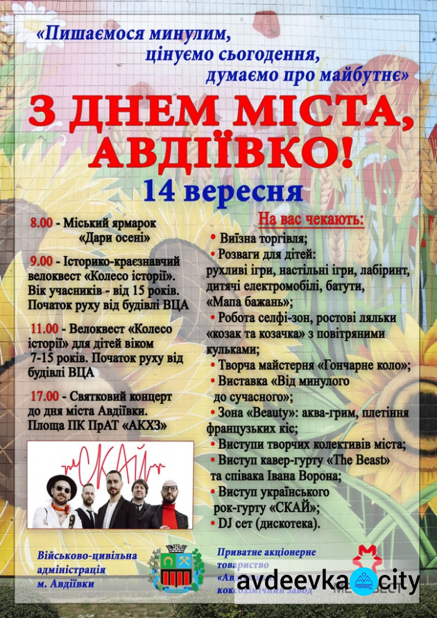 Також протягом дня жителі Авдіївки зможуть прийняти участь у ярмарку, історичному велоквесті та святковому концерті за участі популярних артистів. Завершиться захід дискотекою.