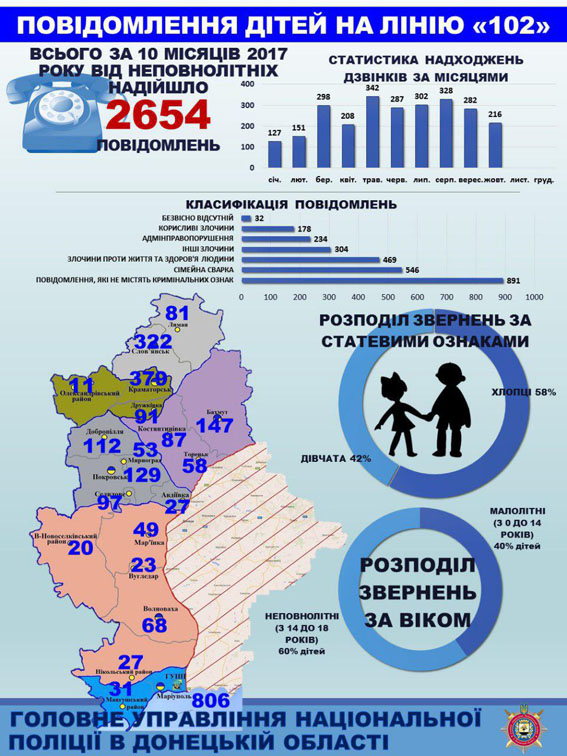 За 10 месяцев 2017 года в колл-центр 102 полиции Донетчины позвонили более 223 тысяч заявителей, 2654 из которых дети.