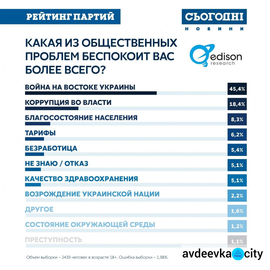 Результаты опроса также свидетельствуют о том, что больше всего украинцев беспокоит война на востоке Украины (46%). Также украинцев беспокоит проблема благосостояния населения (8% опрошенных), тарифы (6%), качество здравоохранения (5%) и безработица (5%). Значительно меньше украинцы переживают из-за возрождение украинской нации – 2%, состояния окружающей среды – 1%, преступности – 1%, остальное – 2%. Затруднились ответить 4% опрошенных.