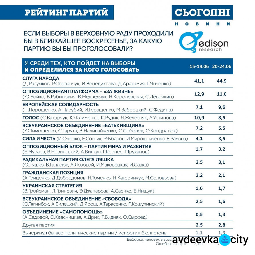 Среди партий, за которые будут голосовать украинцы, определившиеся со своим выбором, лидирует "Слуга народа" (15-19 июня – 41,1%; 20-24 июня – 44,9%).