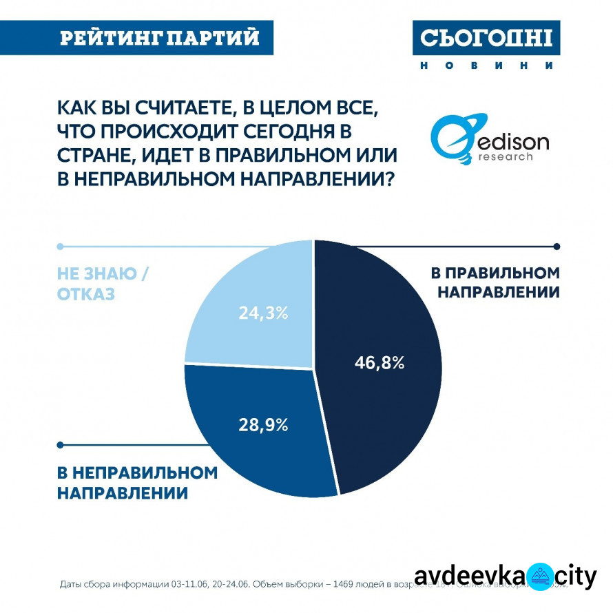 46% украинцев считают, что в целом все, что происходит сейчас в Украине, идет в правильном направлении. 28,9% украинцев с этим не согласны, еще 24,3% не имеют ответа на этот вопрос.