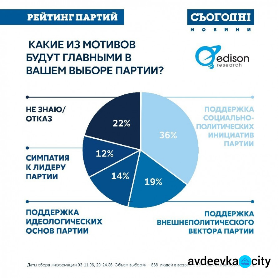 Ведущими мотивами в выборе партии стали симпатия к лидеру партии – 12% опрошенных, поддержка социально-политических инициатив партии – 36%, поддержка идеологических основ партии – 14%, поддержка внешнеполитического вектора партии – 19%. Отказались отвечать 22% опрошенных.