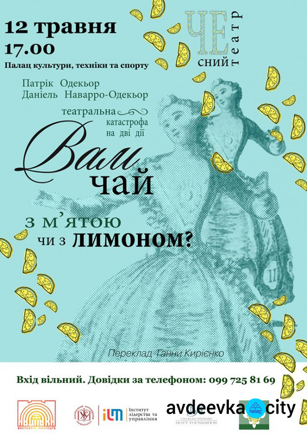 У неділю, 12 травня, о 17.00 на сцені Палац культури, техніки та спорту АКХЗ відбудеться сучасна вистава "Вам Чай з м'ятою чи з лимоном?". Вхід вільний.