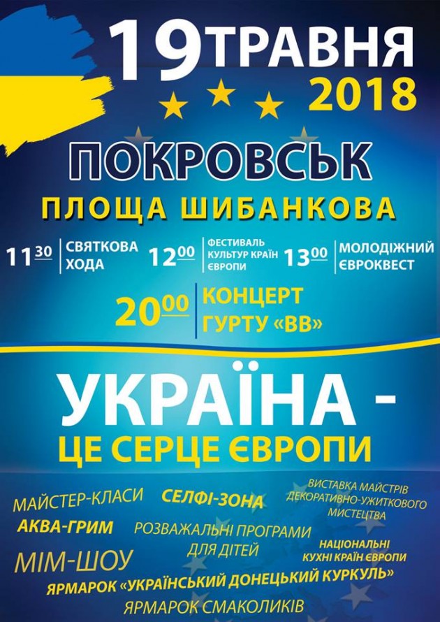 В 12:00 стартует фестиваль культур стран Европы. В 13:00 начнется молодежный евроквест. Параллельно в районе площади Шибанкова и бульвара Андрющенко будут работать мастер-классы, селфи-зоны, аква-грим, мим-шоу, ярмарка вкусностей, развлекательные программы для детей, выставка декоративно-прикладного искусства, ярмарка «Украинский донецкий куркуль» и национальная кухня стран Европы. Все эти мероприятия продлятся с 10:30 до 20:00.