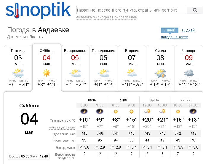 В течение субботы и воскресенья, 4-5 мая, в Авдеевке ожидается ясная погода с максимальной температурой + 21 по Цельсию (°C).