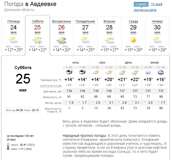 Выходные дни, 25-26 мая, городу Авдеевка синоптики обещают с дождями и грозами.