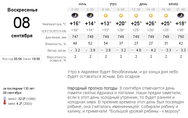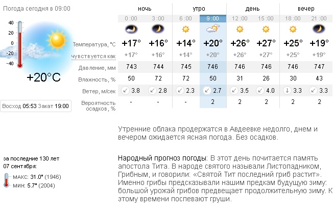 В субботу, 7 сентября, утренние облака продержатся в Авдеевке недолго. Днем и вечером ожидается ясная погода. Без осадков. Температура воздуха от + 14 ранним утром до + 27 днем.
