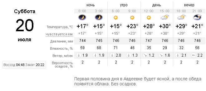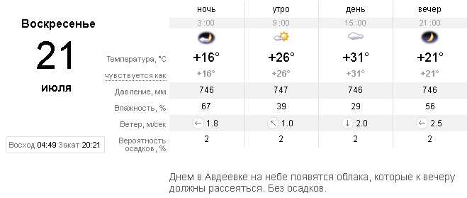 В воскресенье, 21 июля, днем в Авдеевке на небе появятся облака, которые к вечеру должны рассеяться. Без осадков. Температура от + 16 ночью и ранним утром до + 31 днем.