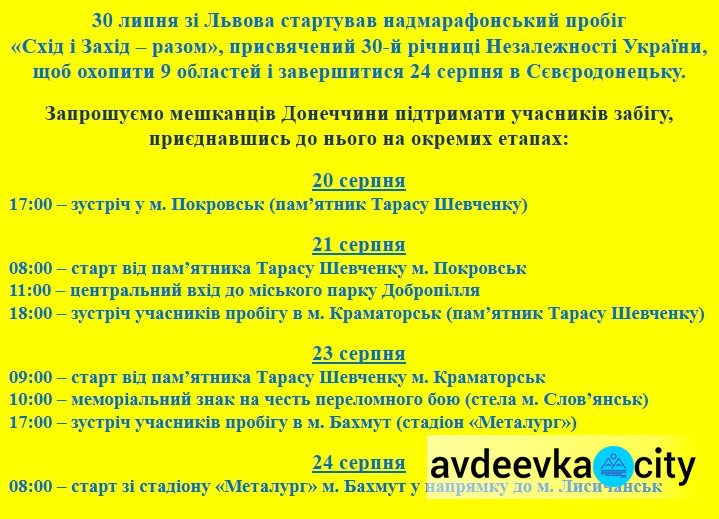 К 30-летию независимости Украины через всю страну проходит патриотический пробег «Восток и Запад – вместе». Сверхмарафон протяженностью 1388 километров стартовал 30 июля во Львове и финиширет в Северодонецке 24 августа. Управление физкультуры и спорта Донецкой ОГА приглашает поддержать марафон, присоединившись к нему на отдельных этапах, сообщает avdeevka.city.