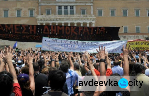 Митингующие у стен парламента демонстрируют moutza