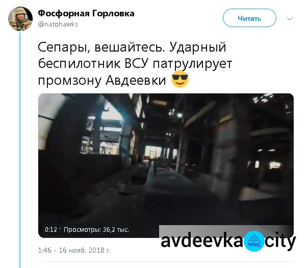 Соответствующее видео опубликовано в Twitter-аккаунте Фосфорная Горловка. "Сепары, вешайтесь. Ударный беспилотник ВСУ патрулирует промзону Авдеевки", - говорится в подписи к кадрам. Позже они появились и на youtube.
