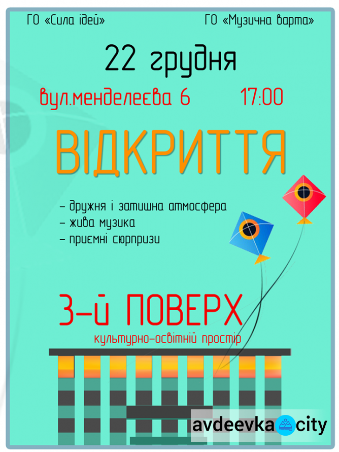 «Ми запрошуємо на відкриття кожного, хто долучився до створення цього простору в будь-якій формі та тих, кому цікаво, що таке "Третій поверх". Віримо, що простір стане платформою для розвитку та активності в Авдіївці через різноманітні культурно-освітні проекти для молодих людей і не тільки», - закликають організатори заходу.