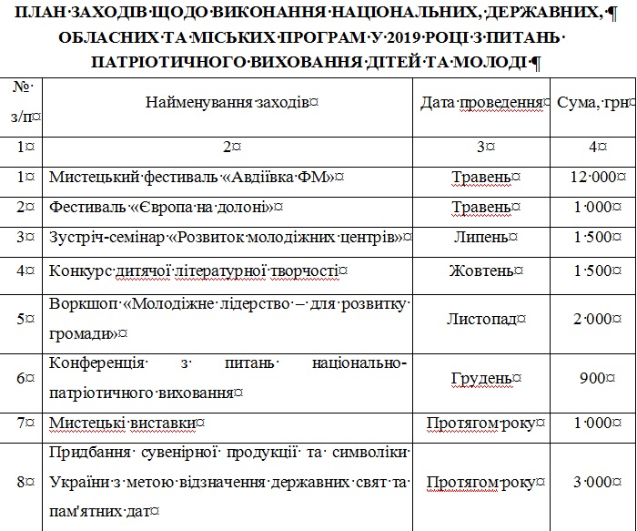 Керівник військово-цивільної адміністрації прифонтового міста Авдіївка Павло Малихін видав розпорядження про затвердження Плану заходів на 2019 рік з реалізації Програми національно-патріотичного виховання дітей та молоді.
