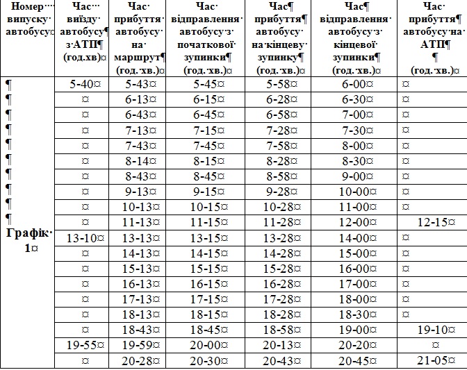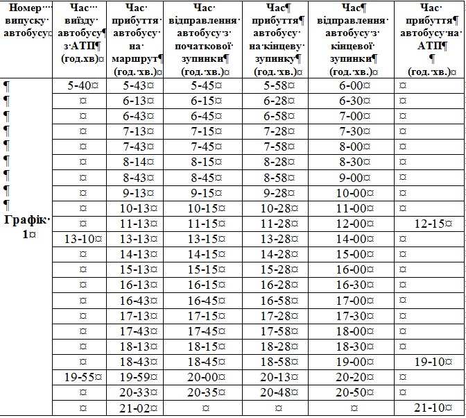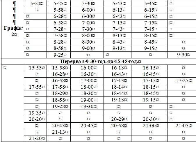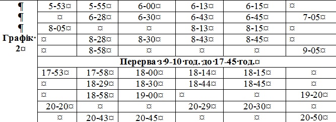 Режим перевезень: графік 1 – робочі дні; графік 2 - робочі дні