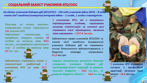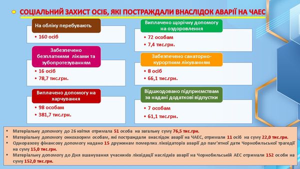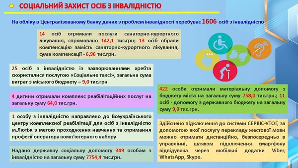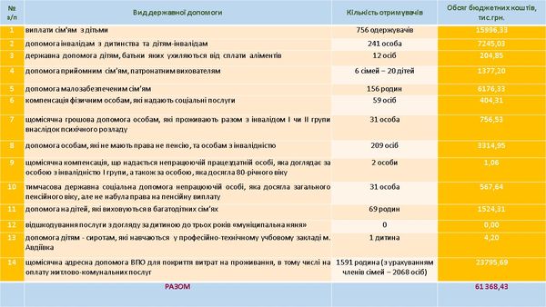 Державну соціальну допомогу на загальну суму 61,4 млн гривень отримали 3164 особи. Було надано 46 видів допомоги.