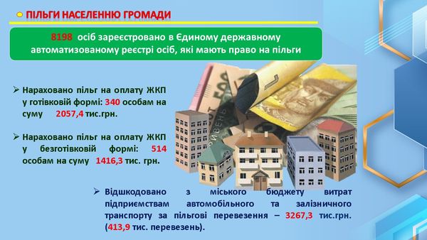 Субсидія на оплату житлово-комунальних послуг у грошовій формі отримали 886 родин. Загальна сума - 5575,7 тис. гривень. Середній розмір в опалювальний період склав 861,8 гривні, в неопалювальний - 334,6 гривні.