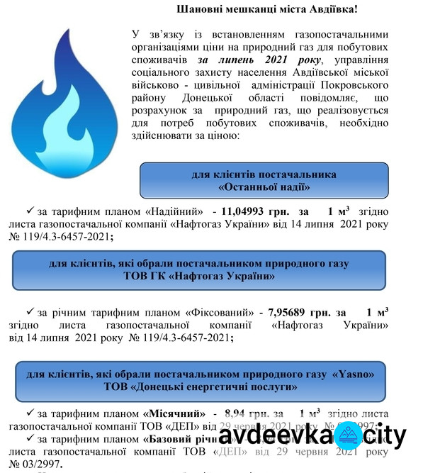 Міське управління соцзахисту населення повідомляє городян про те, що нарахування житлових субсидій та пільг на оплату житлово-комунальних послуг за липень 2021 року проведено з урахуванням цін, приведених нижче.