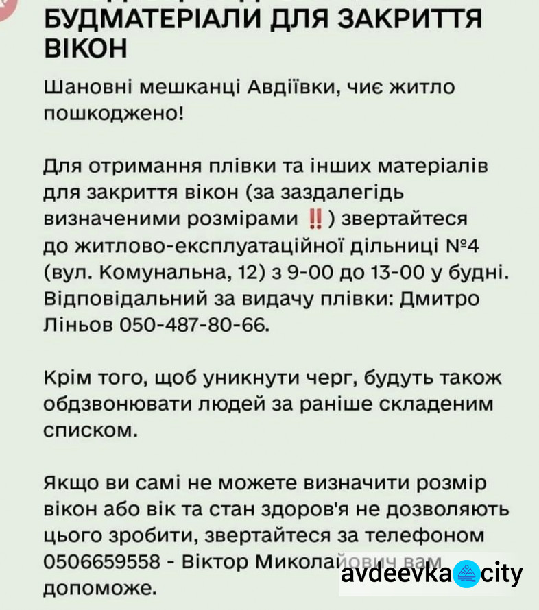 Раніше повідомлялось, видача плівки та інших матеріалів для закриття вікон проходить в приміщенні житлово-експлуатаційної дільниці №4 КП "СЄЗ", розташованому за адресою: вул. Комунальна, 12, по буднях з 9-00 до 13-00.