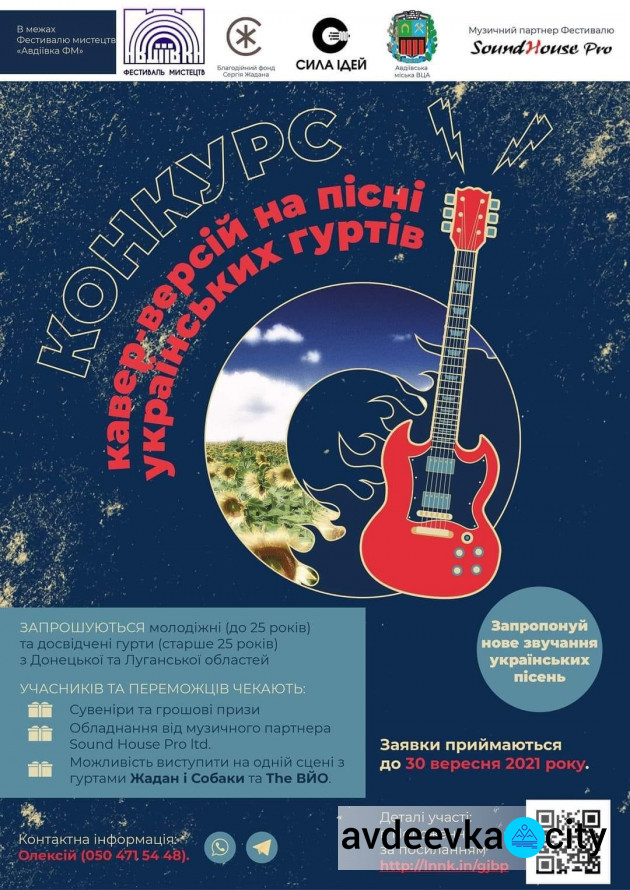 Команда ГО міста Авдіївка "Сила ідей" в межах фестивалю Авдіївка. Фестиваль Мистецтв за підтримки Авдіївської міської ВЦА та Благодійного фонду Сергія Жадана та у партнерстві з SoundHousePro оголошує конкурс кавер-версій пісень українських гуртів серед музикантів Донецької та Луганської областей, повідомляє avdeevka.city за посиланням на сторінку організації у Facebook.