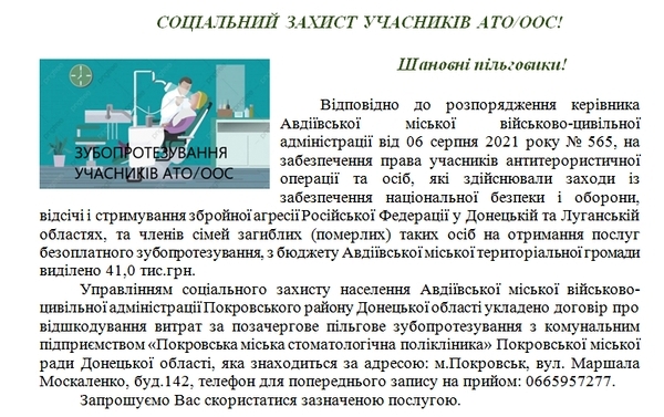 Міське управління соцзахисту населення уклало договір з Покровською стоматологичною полікліникою на надання послуг з зубопротезування пільговим категоріям авдіівців. Зокрема, участникам АТО/ООС та членам іх семей, повідомляє avdeevka.city.