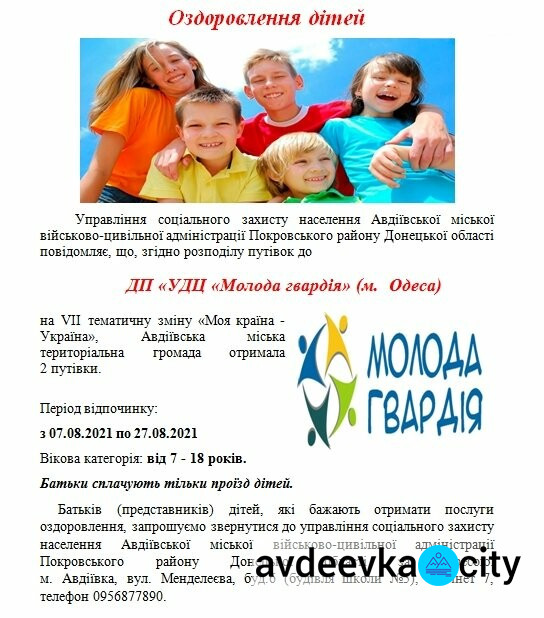 Міське управління соціального захисту населення запрошує авдіївців отримати послуги з оздоровлення дітей у ДЦ «УДП «Молода гвардія», повідомляє avdeevka.city.