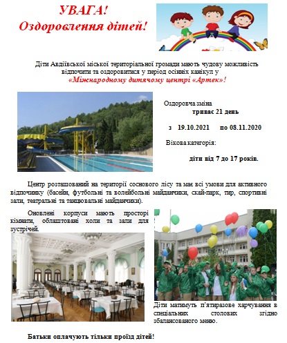 Управління соціального захисту населення ВЦА м. Авдіївки Донецької обл. Запрошує отримати послуги з оздоровлення дітей, повідомляє avdeevka.city.