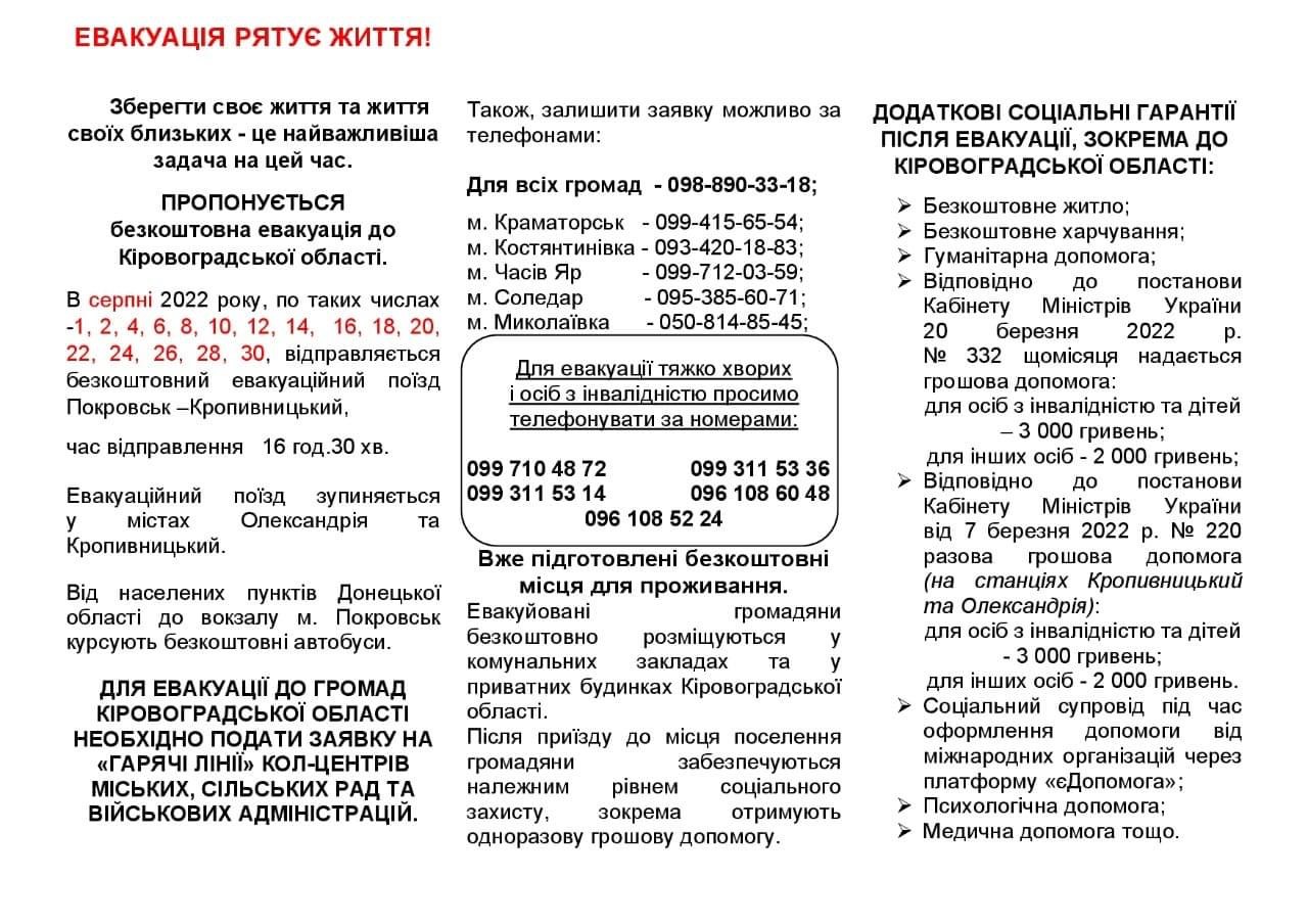 Донецька облдержадміністрація інформує, що 01 серпня 2022 року о 16 год. 30 хв. із м. Покровськ відправляється безкоштовний евакуаційний поїзд Покровськ-Кропивницький.
