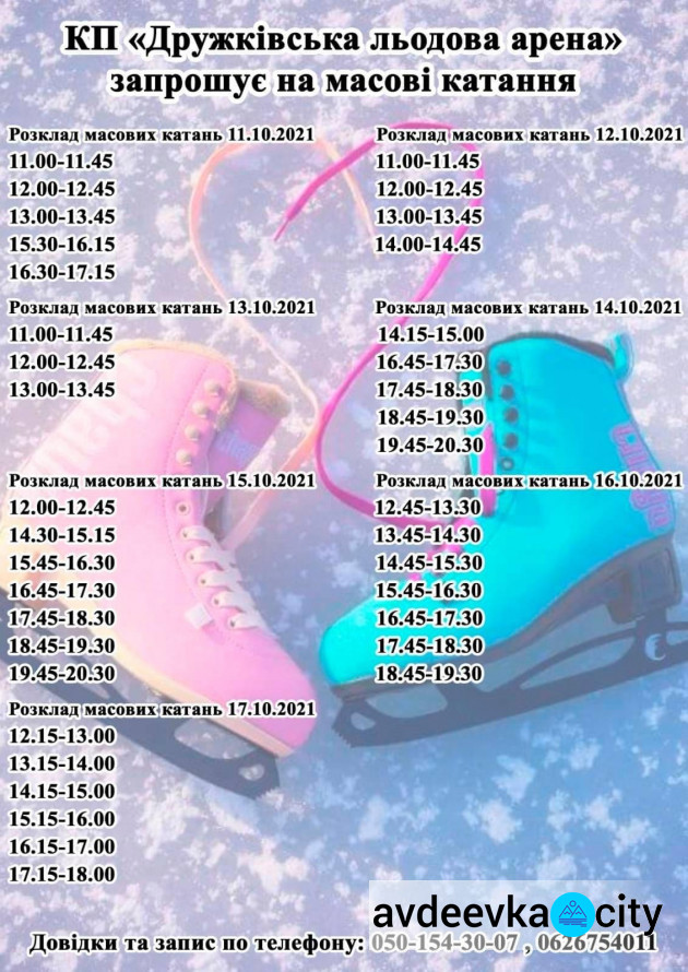 Катання на ковзанах - це неймовірне задоволення від руху і вправності власного тіла. Навіть якщо ви новачок у цьому виді спорту, можна втішитеся власним успіхом, що ростиме із кожним новим колом катання. Тож для всіх адіївців, бажаючих можуть долучитися до масових катань на льодовій арені у м. Дружківа, публікуємо розклад: