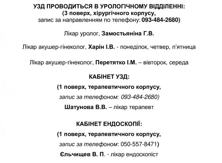 Лікарі проводять прийом у лікувально-діагностичному відділені - вул. Соборна, 20.