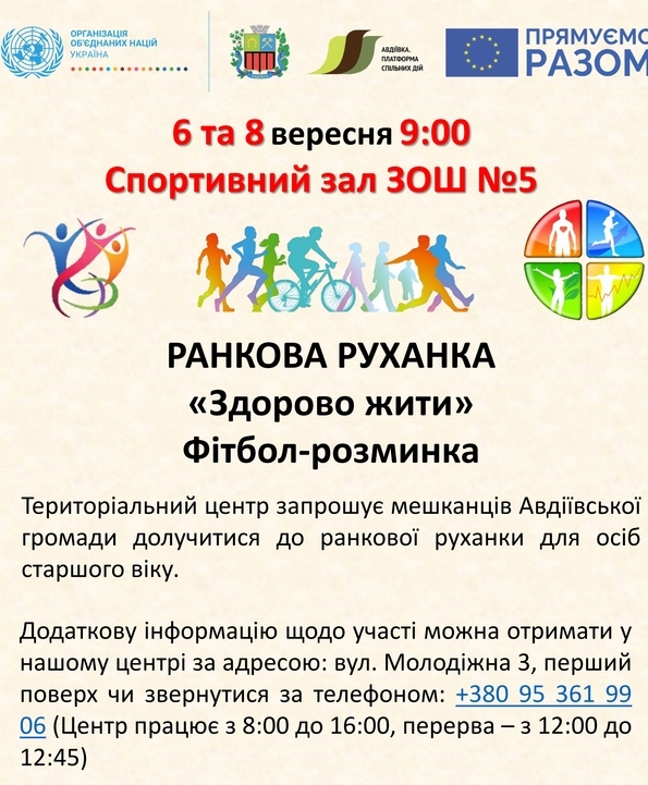 У межах проєкту «Активне та безпечне довголіття: центр психосоціальної підтримки, дозвілля та особистого розвитку вразливих верств населення Авдіївської громади», шо реалізується ГО «Платформа спільних дій» у партнерстві з Авдіївською міською ВЦА у межах програми ООН із відновлення та розбудови миру за фінансової підтримки Европейського союзу в Авдіївці для людей похилого віку пройдуть спортивні активності, повідомляє avdeevka.city.