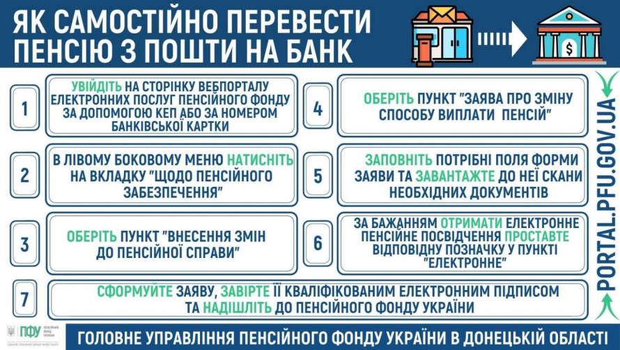 Покрокову інструкцію, як самостійно перевести пенсію з пошти на банк, оприлюднило Головне управління Пенсійного фонду України в Донецькій області , повідомляє avdeevka.city.