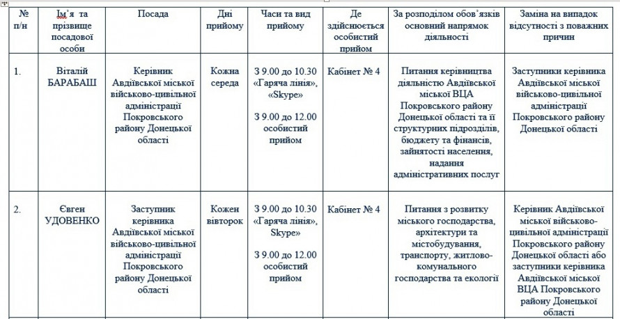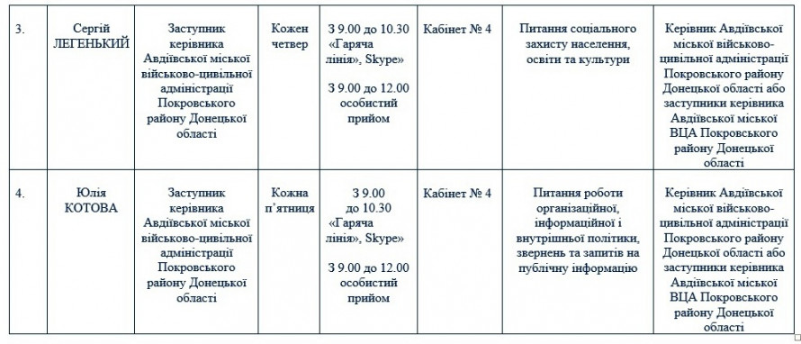 Графікb особистих прийомів громадян, функціонування телефонного зв’язку з населенням «Гаряча лінія» та прийому усних звернень за допомогою програмного забезпечення «Skype» на 2022 рік оприлюднили на сайті Авдіївської міської військово-цивільної адміністрації, повідомляє avdeevka.city.
