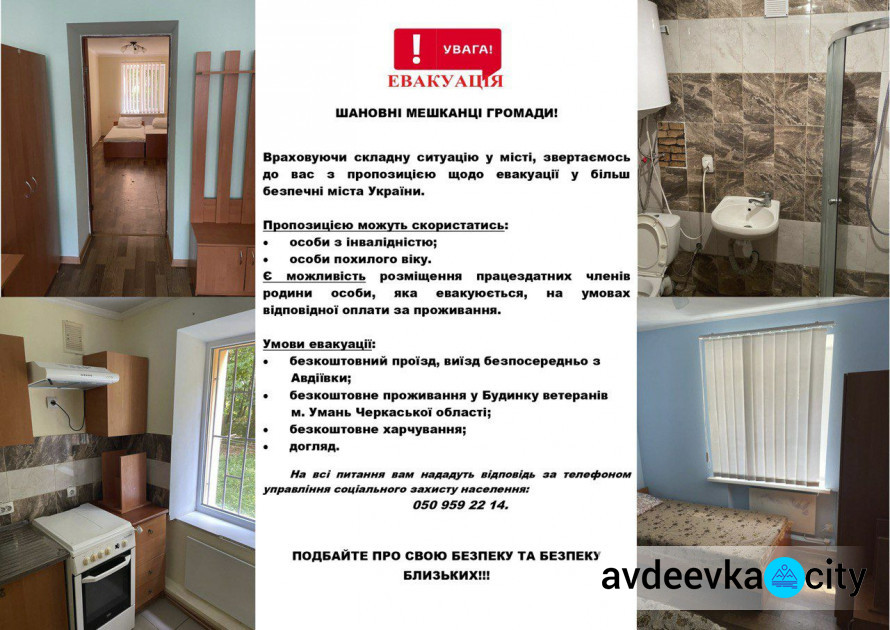Враховуючи складну ситуацію в місті, Авдіївська міська військова адміністрація звертається до містян з пропозицією евакуюватися до міста Умань Черкаської області.