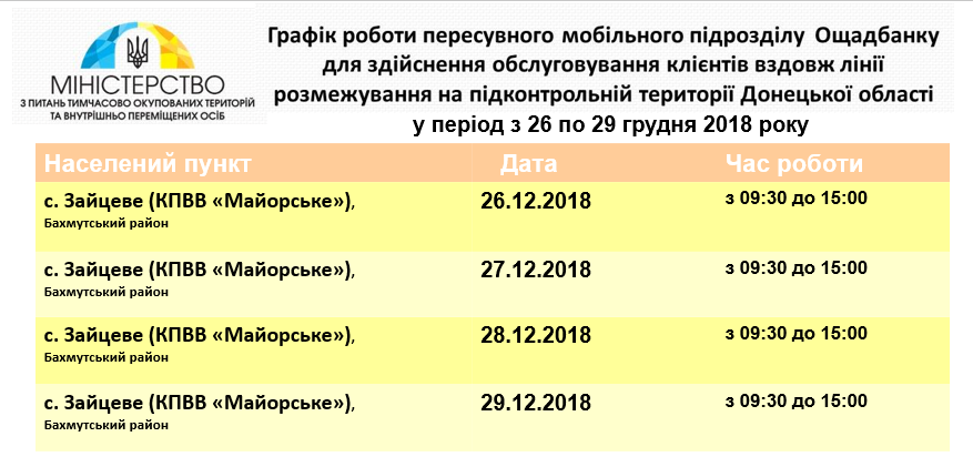 С 26 по 29 декабря в Донецкой области вблизи линии разграничения будут работать мобильные подразделения «Ощадбанка».