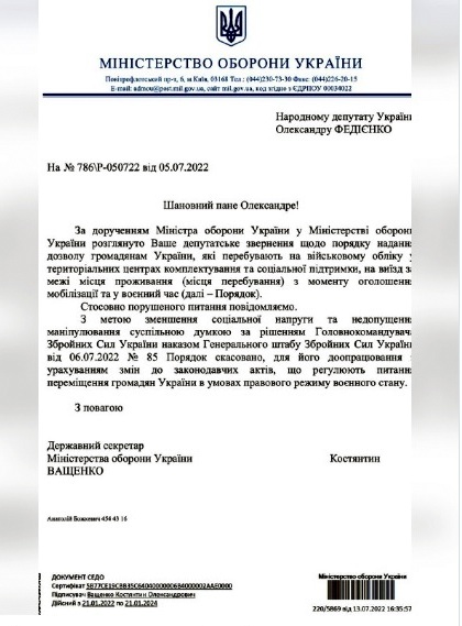 Згідно з документом, який опублікував нардеп, чоловікам можна вільно їздити в межах України.