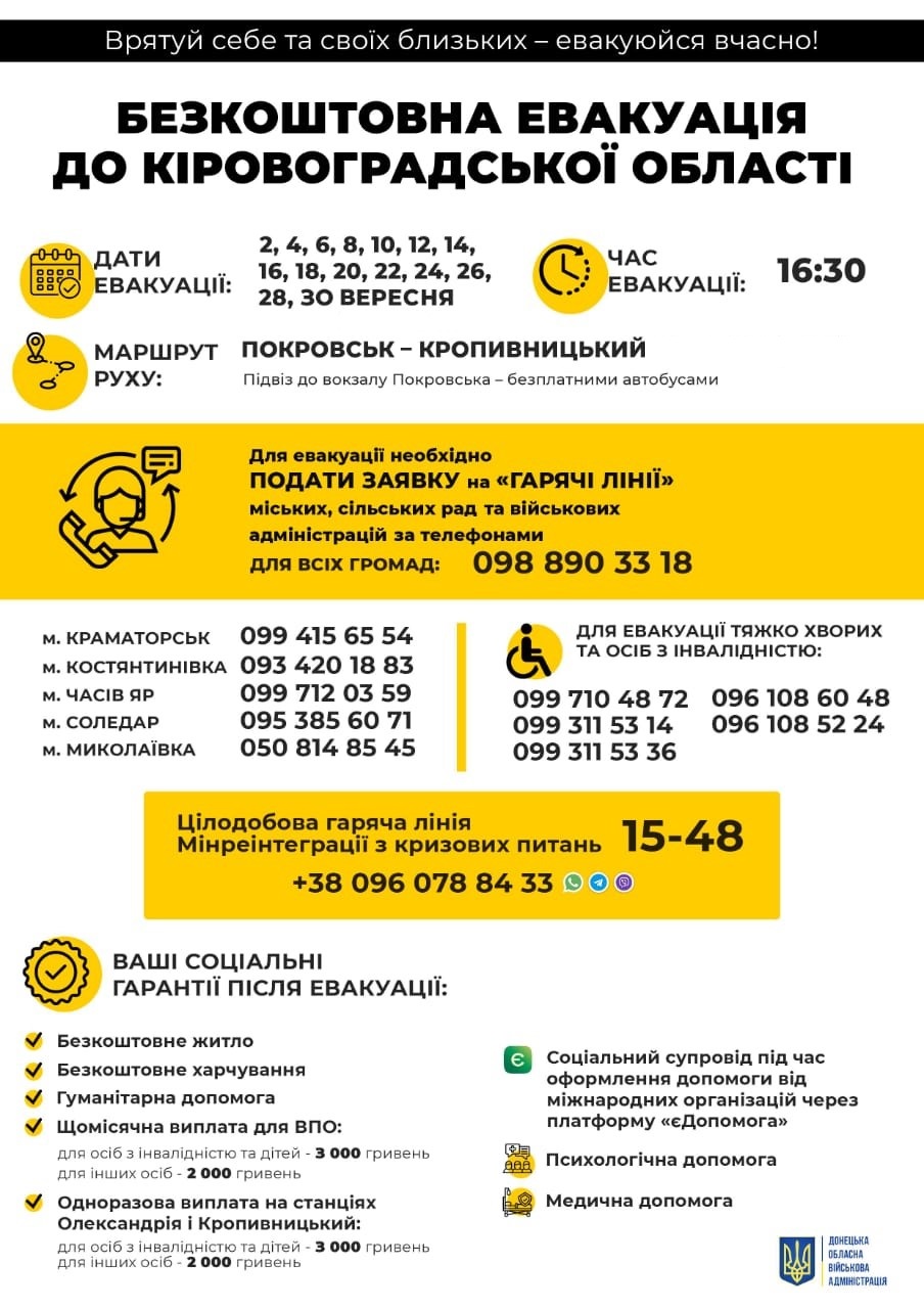 - дістатися до місця збору, звідки буде безкоштовний підвіз до евакуаційного потягу у Покровську;