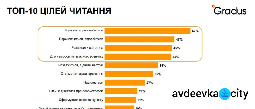 Українці зазначили, що читають переважно з метою відпочити і розслабитися. Таких 57%. Також переключитися і відволіктися за допомогою книги – метод для 47% читачів.
