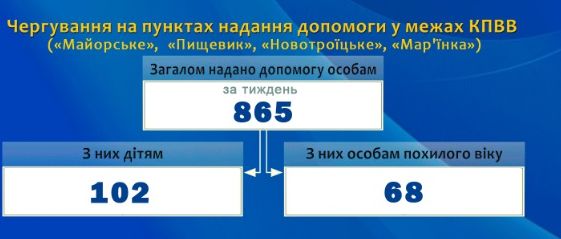 В течение недели в пункты оказания помощи обратились 865 граждан, в том числе 102 ребенка и 68 пожилых людей. С начала функционирования пунктов там оказана помощь 96 767 лицам (из них 6602 ребенка и 18 595 людей пожилого возраста), сообщает сайт спасателей Донетчины.