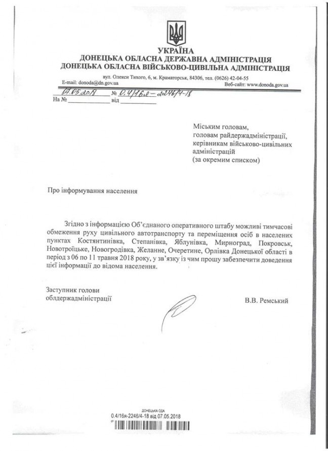 Напомним, что в список населенных пунктов, где 6 по 11 мая будет временно ограничено движение гражданского автотранспорта и перемещение лиц, попали: Константиновка, Степановка, Яблоновка, Мирноград, Покровск, Новотроицкое, Новогродовка, Желанное, Очеретино, Орловка в Донецкой области, а также Михайловка и Софиевка - в Луганской области.