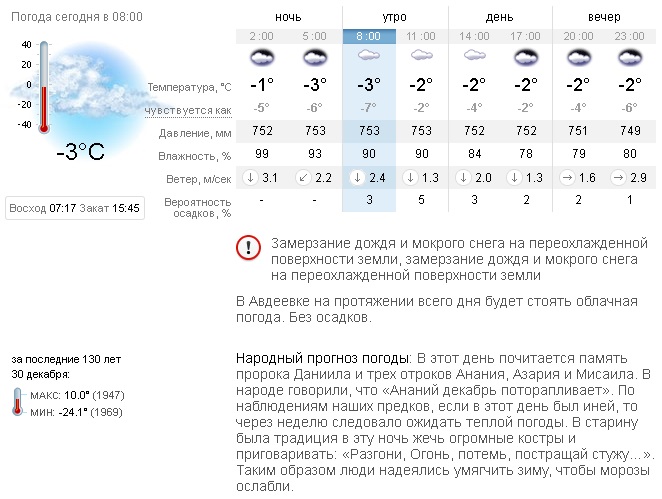 Сегодня, 30 декабря, синоптики прогнозируют в Авдеевке на протяжении всего дня облачную погоду без осадков. Но если они всё же случаться – это будет чревато замерзанием дождя и мокрого снега на переохлажденной поверхности земли.