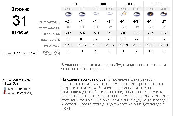 В последний день года, 31 декабря, в Авдеевке солнце будет редко показываться из-за облаков. Без осадков.