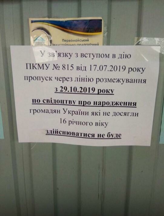 Постановлением Кабинета министров Украины от 17 июля 2019 № 815 «Об утверждении Порядка въезда лиц, перемещения товаров на временно оккупированных территориях в Донецкой и Луганской областях и выезда лиц, перемещения товаров из таких территорий» (вступает в силу в конце октября) усложнился проезд через донбасскую линию разграничения детей, которые не достигли 16-летнего возраста.