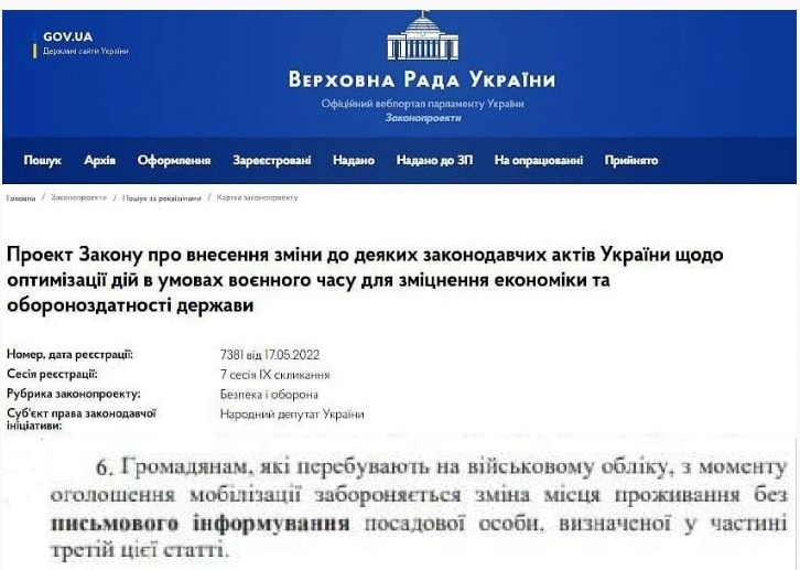 Також пропонується заборонити людям, які перебувають на військовому обліку, після оголошення мобілізації міняти місце проживання без письмового повідомлення уповноваженої особи.