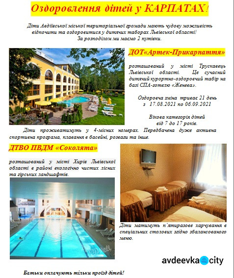 "У зв'язку з обмеженою кількістю місць, запрошуємо батьків (представників) дітей терміново звернутися в управління соціального захисту населення військово-цивільної адміністрації міста Авдіївка Донецької області за адресою: вул. Менделеєва, буд.6 (будівля школи №5), кабінет 7, телефон 095 687-78-90", - повідомляє управління соцзахисту населення.