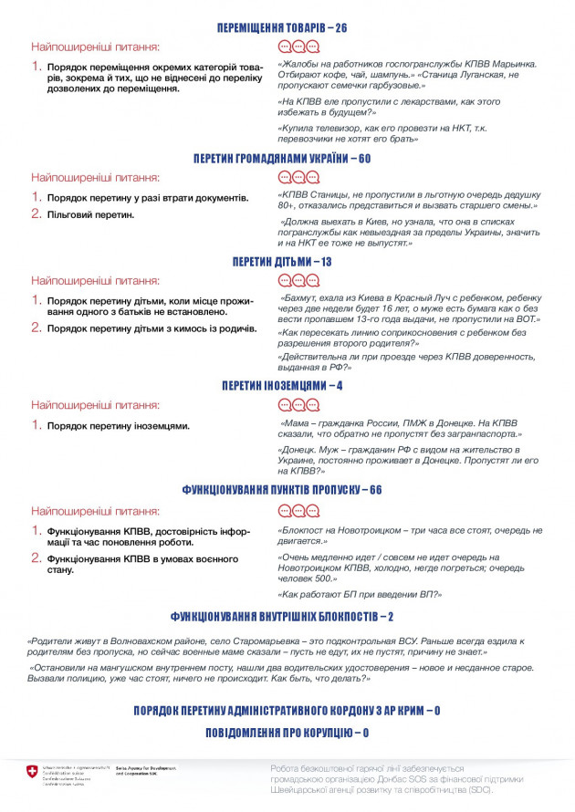 Наиболее востребованными были консультации касательно оформления пропуска в связи с непрохождением «верификации»; вопрос о функционировании базы данных разрешений СБУ, в частности внесение изменений, исправление ошибок, переподача на новый период.