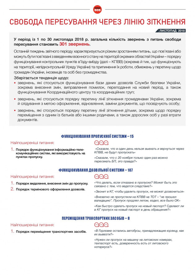 В период с 1 по 30 ноября поступило 301 обращение, посвященное свободе передвижения: 289 - на горячую линию (11,6% всех обращений) и 12 - в онлайн-приемную Организации (7,5% всех обращений).
