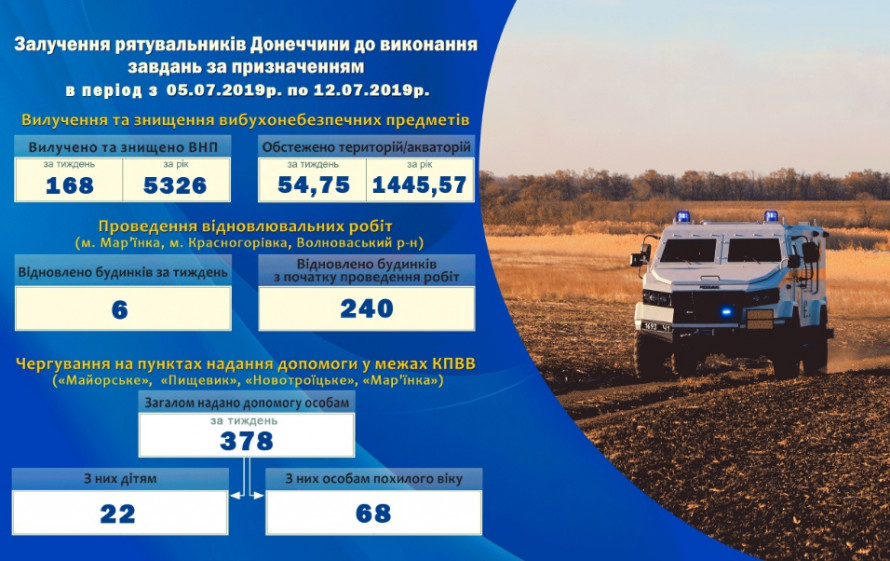 Кроме того, в течение недели пиротехнические расчеты Главного управления ГСЧС Украины в Донецкой области изъяли и уничтожили 168 боеприпасов, а также обследовали
