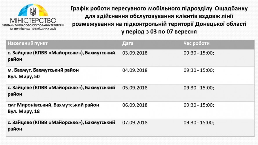 В период с 3 по 7 сентября мобильное подразделение Ощадбанка будет обслуживать клиентов вблизи линии разграничения в Донецкой области следующим образом: