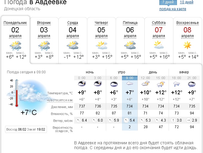 В Авдеевке на протяжении всего дня будет стоять облачная погода. С середины дня и до его окончания будет идти дождь. Температура от + 6 до + 12, сообщает sinoptik.ua