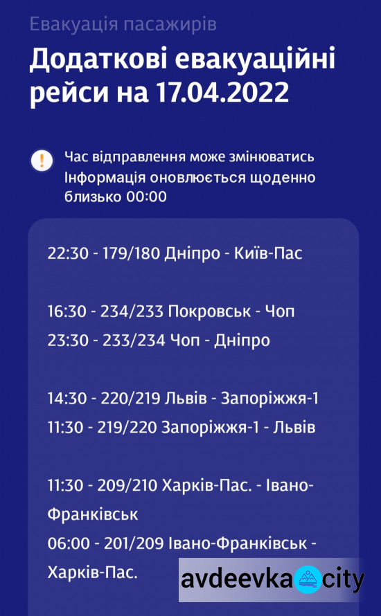 Розклад додаткових евакуаційних поїздів на 17 квітня: